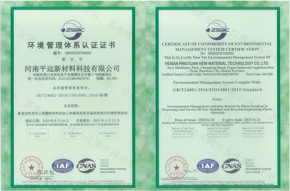 河南平遠(yuǎn)新材料科技有限公司生產(chǎn)基地坐落于河南省鄢陵縣先進(jìn)制造業(yè)開發(fā)區(qū),工廠占地10000平方米。公司通過GRS全球回收標(biāo)準(zhǔn)認(rèn)證、ISO9001質(zhì)量體系、14001環(huán)境體系和45001職業(yè)健康安全管理體認(rèn)證。華東分公司位于浙江省余姚市中國塑料城。